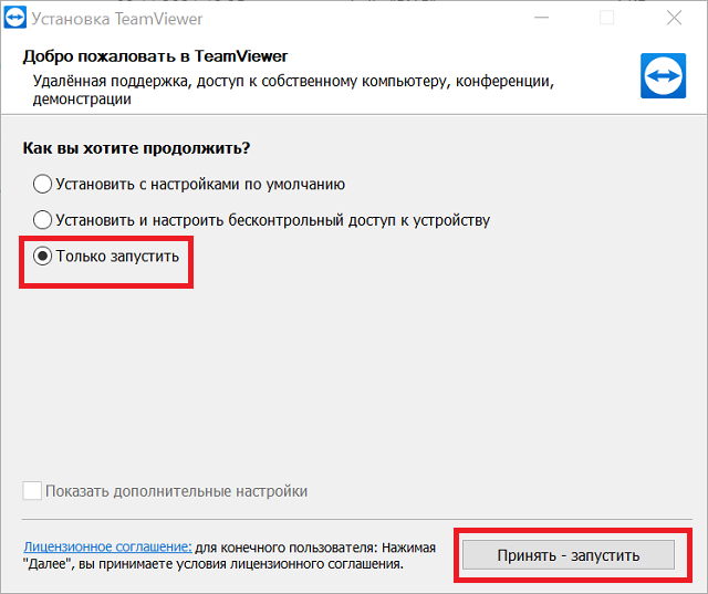 4.Запустите файл TeamViewer_Setup_x64.exe. Выберите «Только запустить». Нажмите кнопку «Принят-запустить». Подтвердите все запросы программы.