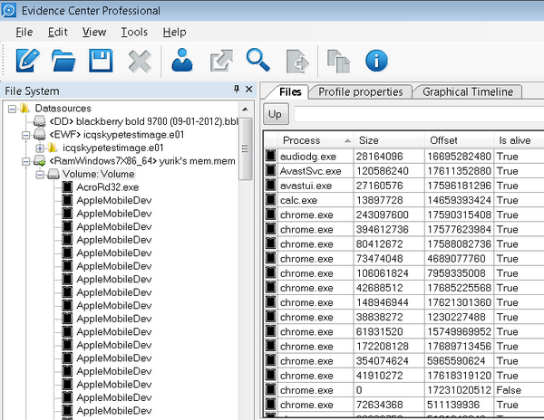 Просмотрщик процессов оперативной памяти работает наподобие просмотрщика файловой системы, только вместо файлов он показывает процессы. К примеру, эксперт может изучить все процессы – работающие или "мёртвые" – внутри дампа памяти Windows 7 и исследовать, скажем, память процесса Skype.exe или AppleMobileDev с помощью побайтового анализа внутри шестнадцатеричного просмотрщика и конвертора типов.