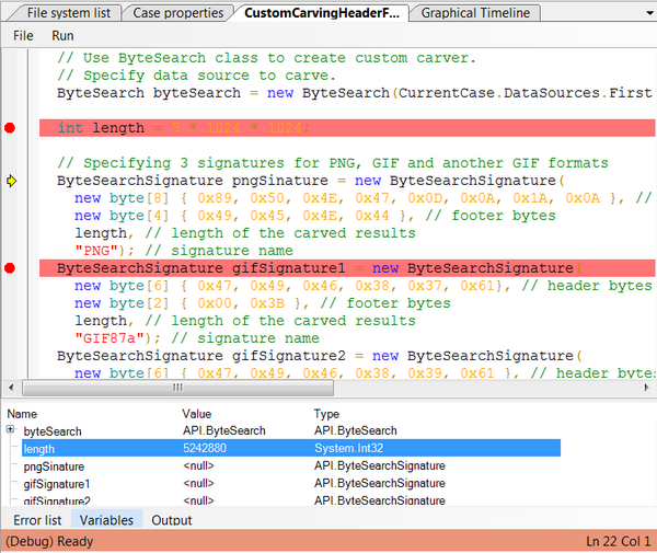 Новый движок скриптинга, который в компании назвали "BelkaScript", делает Evidence Center по-настоящему расширяемым инструментом. BelkaScript использует лёгкий для изучения упрощённый вариант языка программирования C#, так что эксперты могут быстро создать свои собственные модули расширения, дополнив существующую функциональность Evidence Center. В Belkasoft включили в инсталляцию продукта несколько примеров скриптов, что позволит вам легко написать ваш первый скрипт, немного изменив один из уже существующих. Например, один из таких скриптов - это реализация собственного восстановления файлов по методике "header-footer carving", когда задаётся сигнатура начала и конца файла для восстановления.